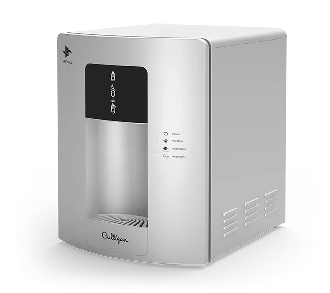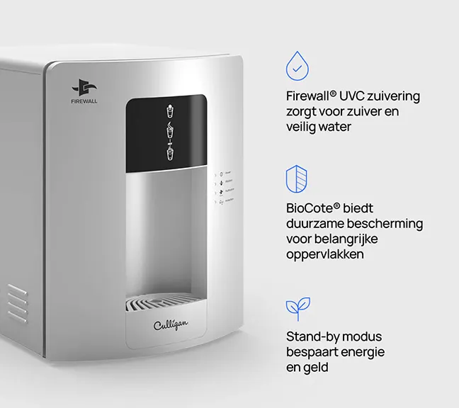 Nos fontaines raccordées sont équipées de la technologie brevetée Firewall® UVC garantissant une eau à 99,9999 % exempte de pathogènes, de la source jusqu’au point de distribution, empêchant bactéries et virus de pénétrer.